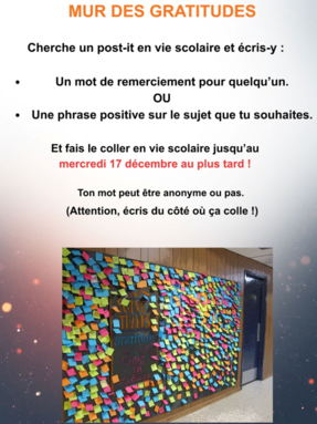 A l'initiative des élèves du CVC , le mur des Gratitudes, c'est une attention envers un-e ami-e, un phrase aimable envers un groupe...Ecrire des mots pour nous relier: Tu peux y participer!